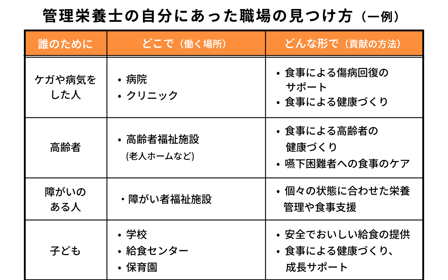 たとえば、子どもが好きで成長や健康を支えたいなら学校や給食センターが適していますし、地域全体に貢献したいなら保健所などの行政機関が選択肢になるでしょう。