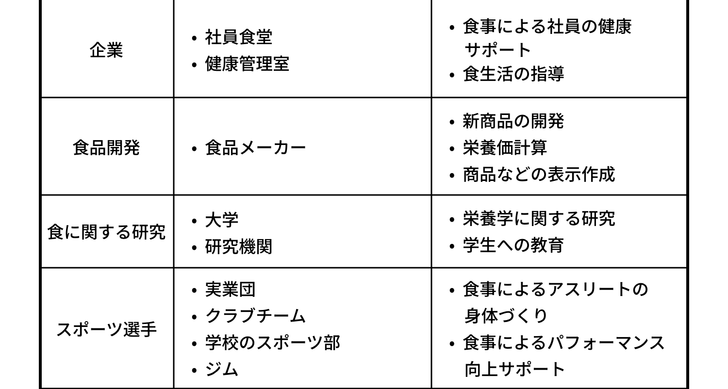 対象となるのは、食事制限が必要な患者や高齢者、妊産婦、乳幼児、さらにはトップアスリートまで。一人ひとりの身体の状態や生活習慣に合わせて食事計画を立て、健康づくりや回復をサポートすることが役割です。